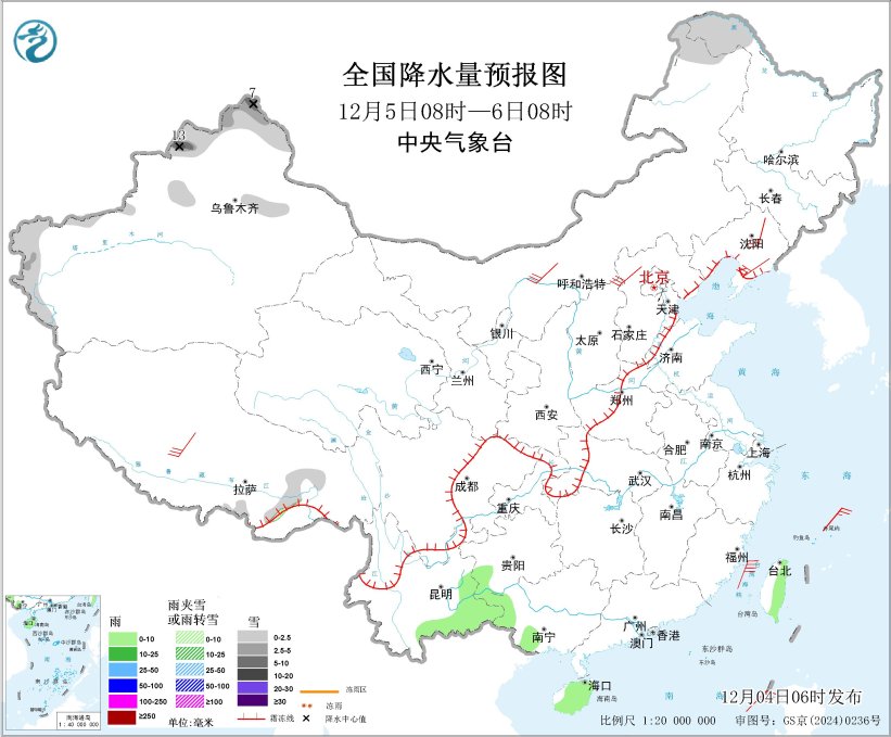 图1 全国降水量预报图(12月4日08时-5日08时)