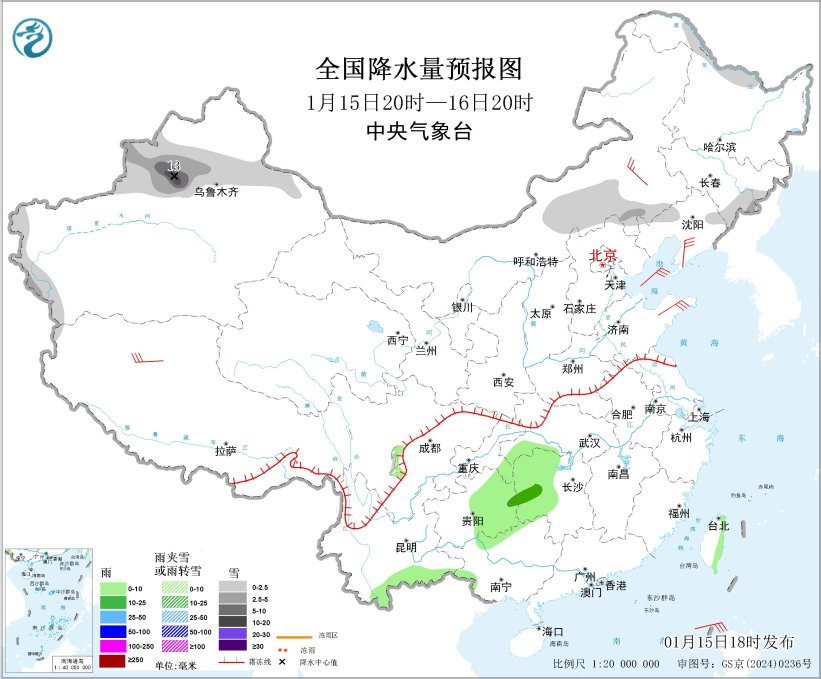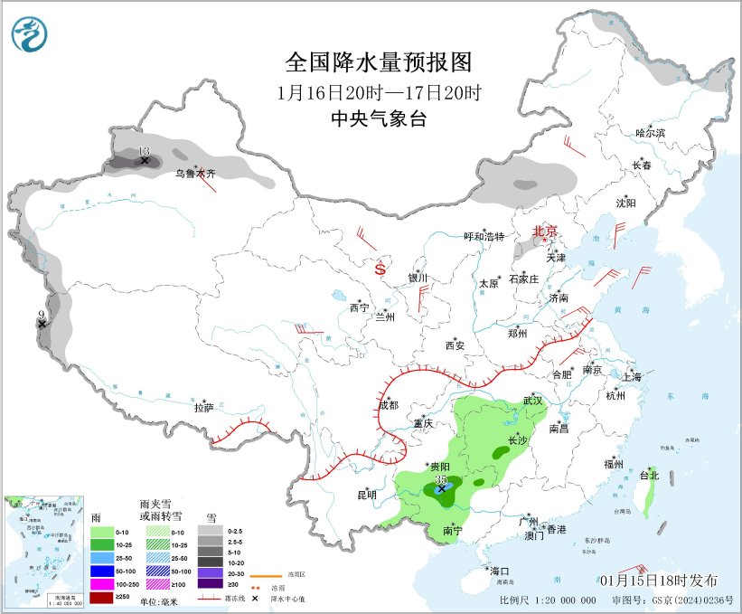 图1 全国降水量预报图(1月15日20时-16日20时)
