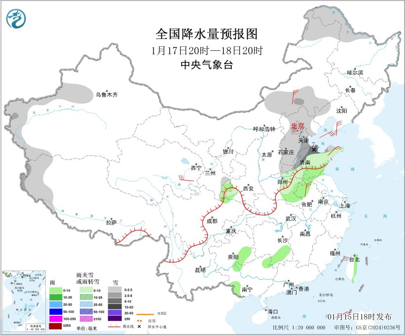 图3 全国降水量预报图(1月17日20时-18日20时)