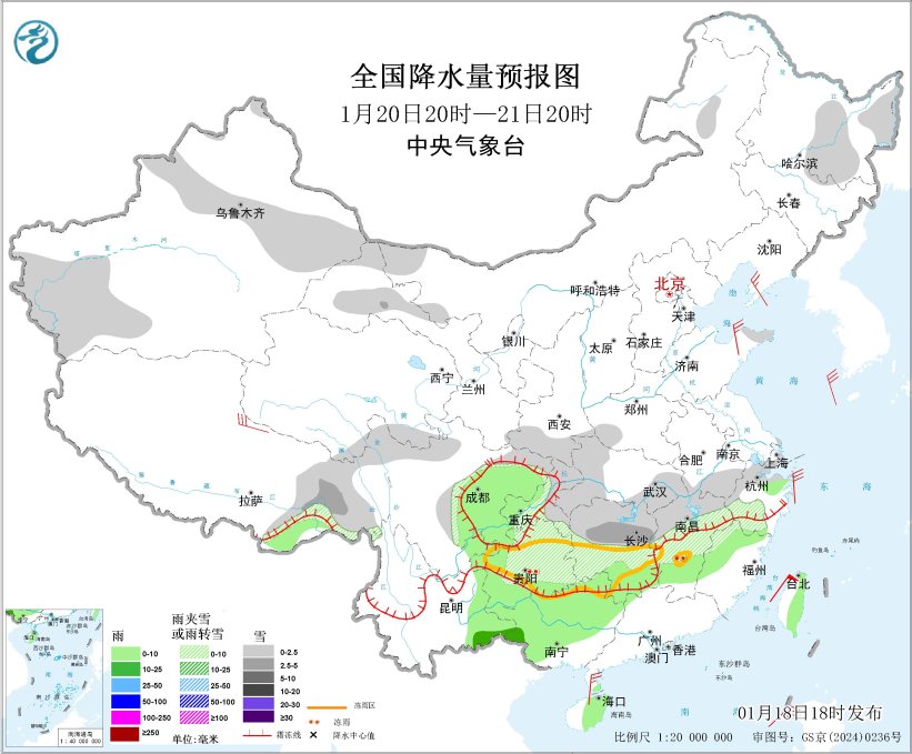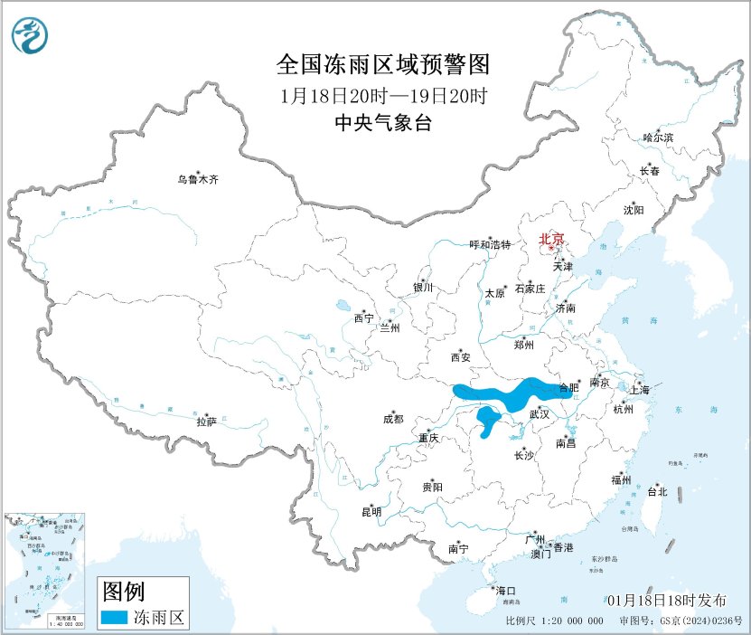 河南中南部、湖北西部、湖南、贵州、重庆东北部等地部分地区有冻雨,预计1月18日20时至19日20时,河南东南部、安徽西部、湖北北部和西部、陕西东南部、重庆北部等地的部分地区有冻雨或冰粒,上述大部地区冻雨量1~3毫米,山区可达3~5毫米、局地8毫米以上(见图4)。中央气象台1月18日18时发布冰冻黄色预警。
