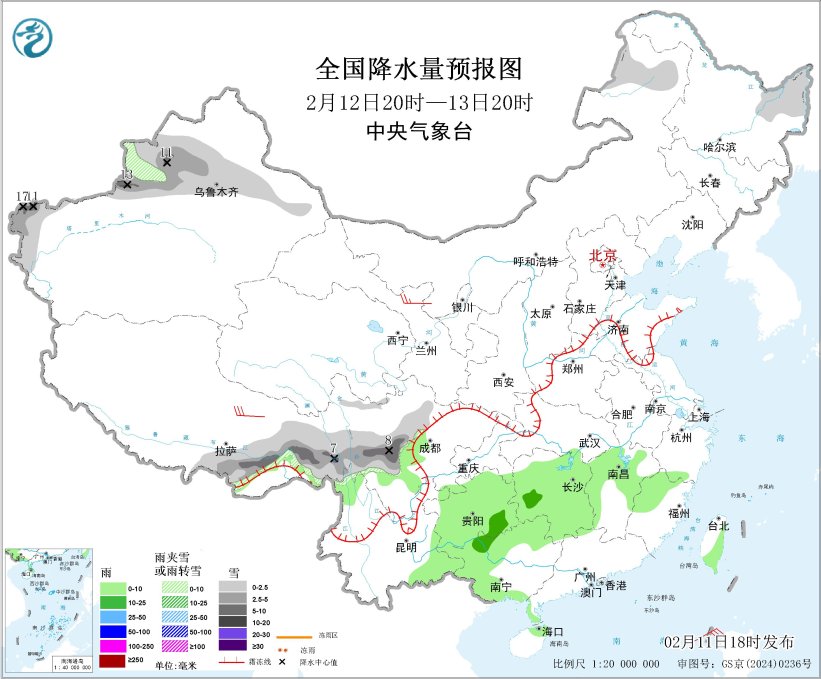 图1 全国降水量预报图(2月11日20时-12日20时)