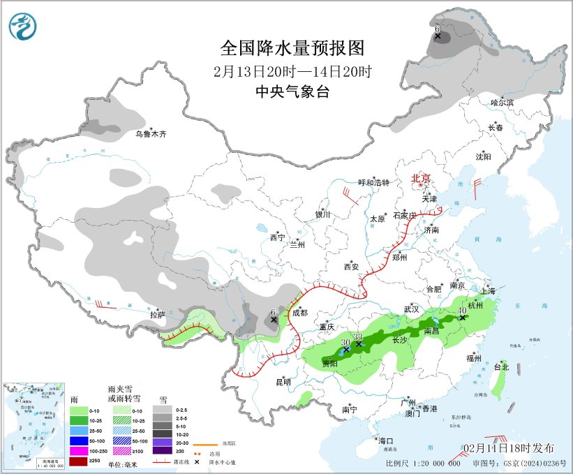 2月13日20时至14日20时,内蒙古东部、东北地区北部、新疆伊犁河谷、南疆东南部和西部山区、西藏中部和东部、青海西南部、川西高原等地部分地区有小雪或雨夹雪,其中,内蒙古东北部、黑龙江西北部、新疆伊犁河谷、西藏东南部、川西高原等地部分地区有中到大雪(5~6毫米)。江南大部、贵州大部和广西北部等地部分地区有小到中雨,其中,湖南西部、贵州东北部和浙江西部等地部分地区有大雨(25~40毫米)。内蒙古南部、辽东半岛、西藏南部等地部分地区有5~6级风,渤海、巴士海峡、南海东北部和西南部海域有4~6级风、阵风7级(见图3)。