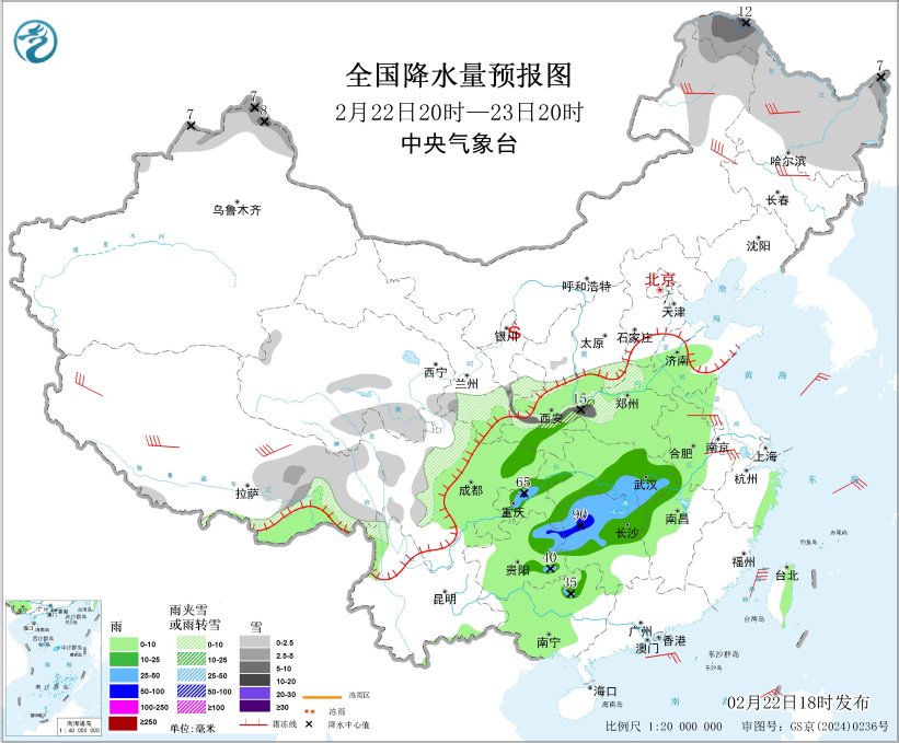 图3 全国降水量预报图(2月22日20时-23日20时)