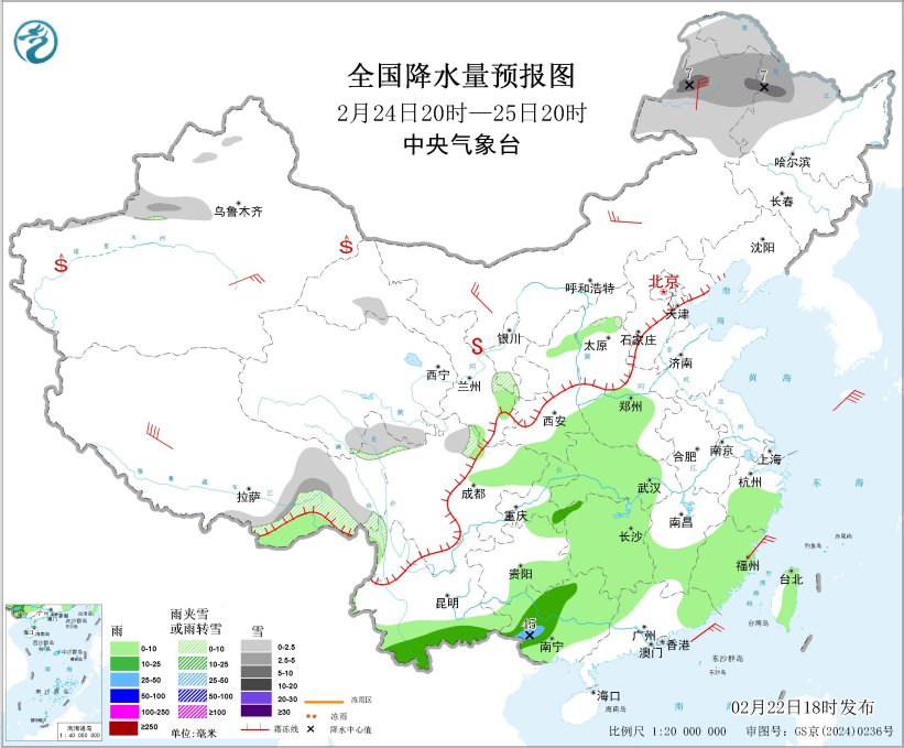 2月24日20时至25日20时,内蒙古东部、黑龙江西部、新疆沿天山地区、西藏东部、宁夏南部、川西高原北部等地部分地区有小雪或雨夹雪,其中,内蒙古东北部、黑龙江西北部等地部分地区有中到大雪(5~7毫米);西北地区东南部、黄淮西部、江汉、江南、西南地区东部和南部、华南北部和西部、台湾岛等地部分地区有小到中雨,其中,广西西南部局地有大雨(25~45毫米)。内蒙古大部、新疆南疆盆地、西藏北部、青海北部、宁夏北部等地部分地区有4~6级风,新疆西部和东部、甘肃河西等地部分地区有扬沙或浮尘;黄海南部海域、东海北部海域、台湾海峡将有6~7级的风(见图5)。